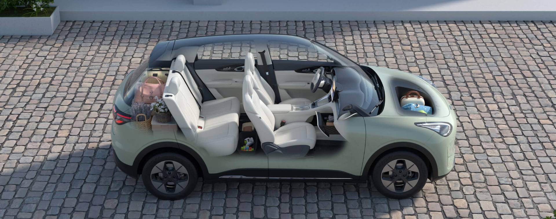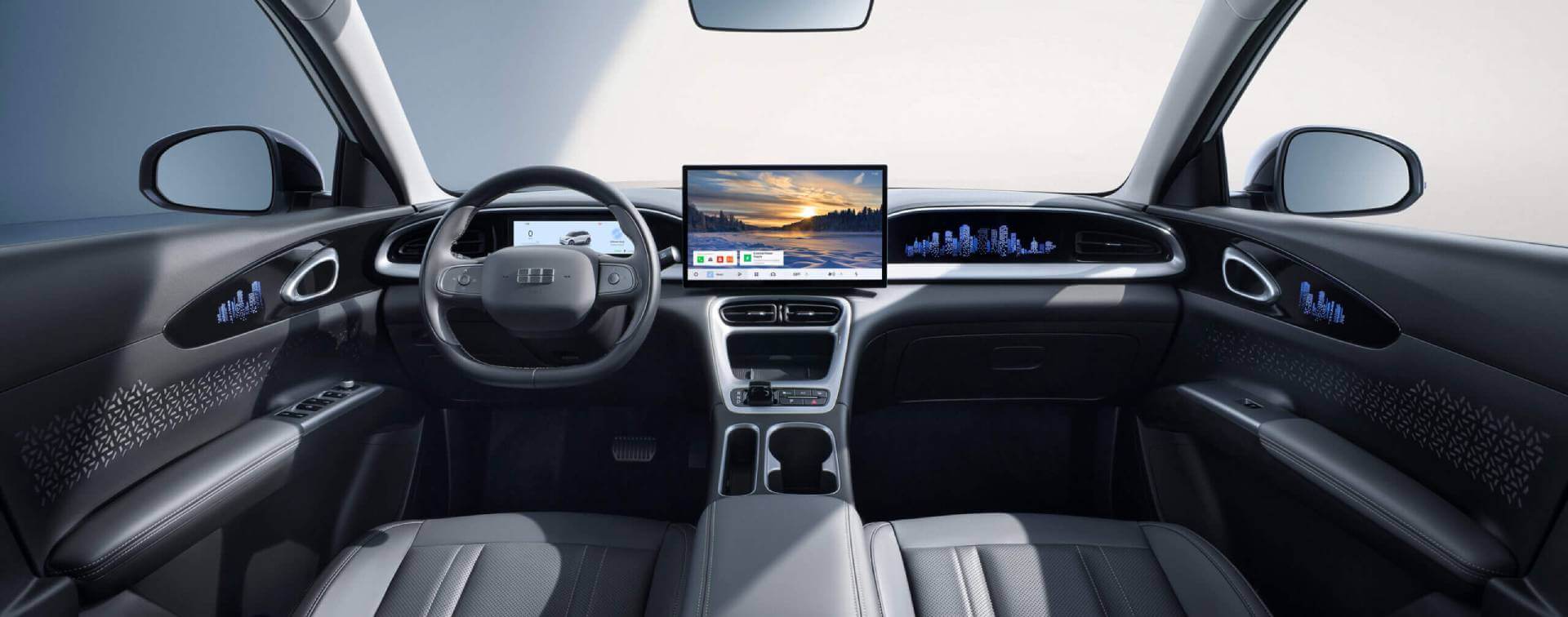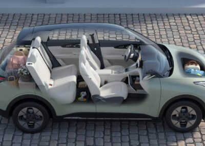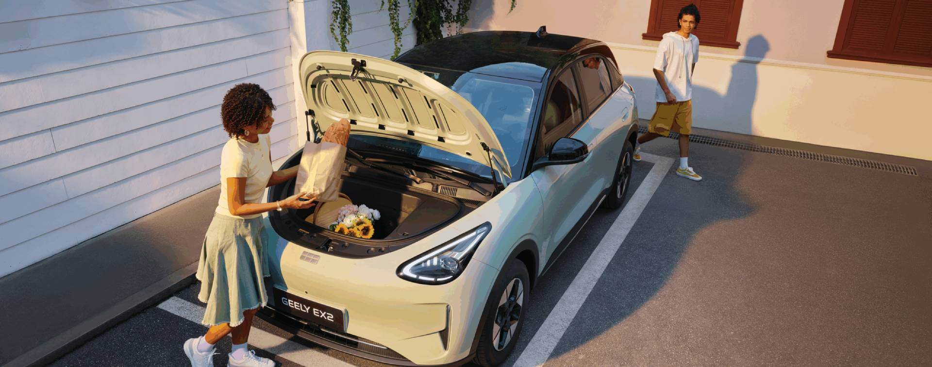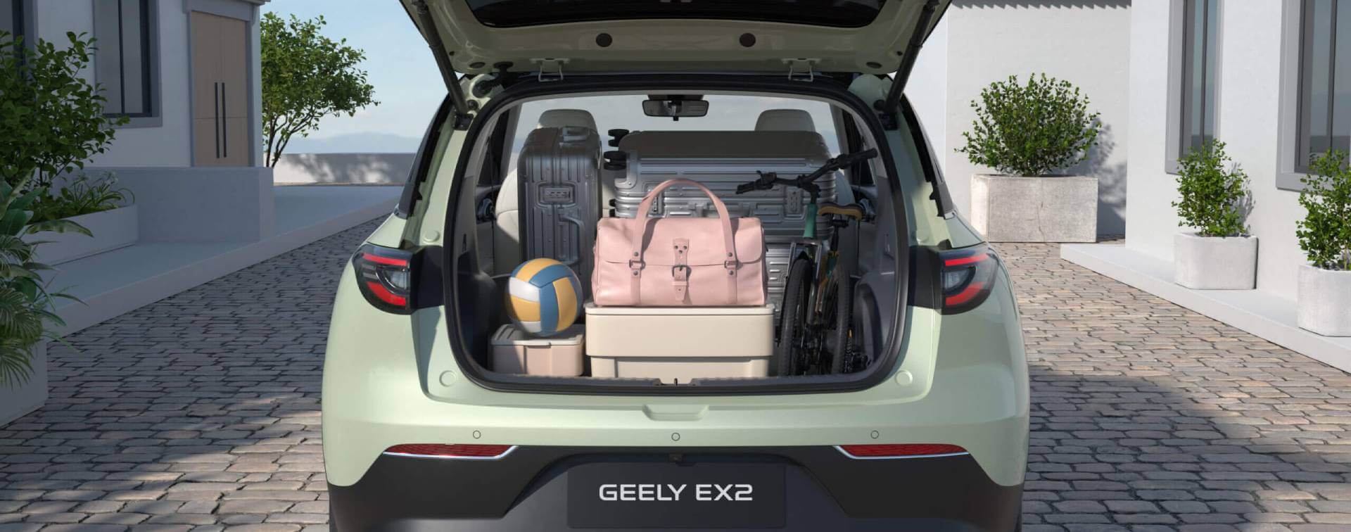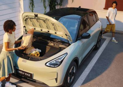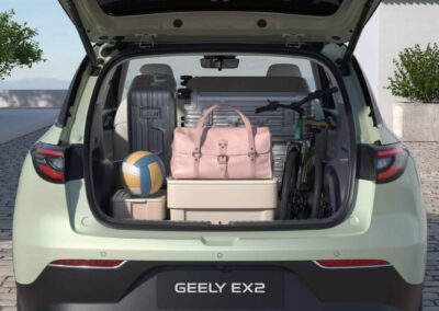 El Geely EX2 ofrece comodidad para cinco ocupantes y un sorprendente espacio interior gracias a su distancia entre ejes de 2650 mm. Su maletero de 1320 L, con los asientos traseros abatidos, garantiza versatilidad para equipaje, bicicletas y equipo. También cuenta con un exclusivo maletero delantero de 70 L y espacio de almacenamiento bajo el asiento trasero.