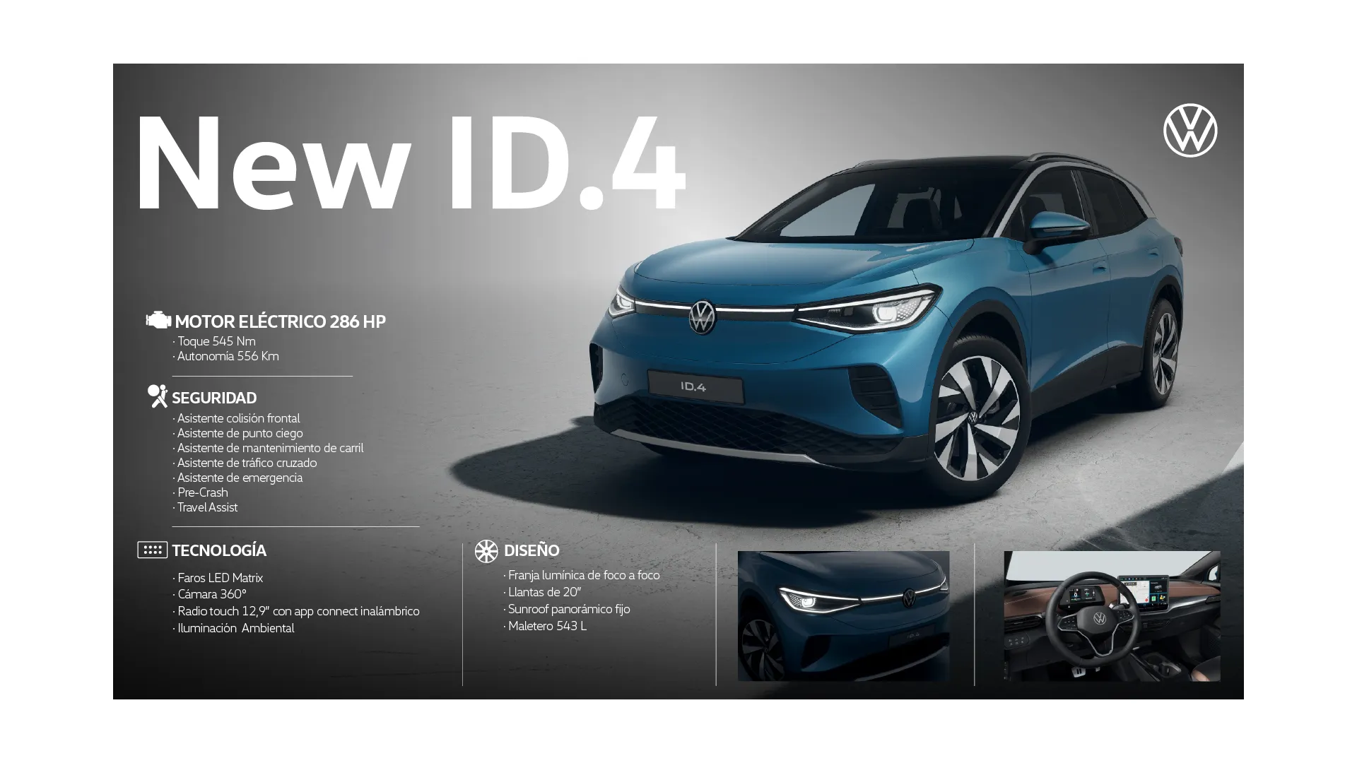 El nuevo ID.4 combina rendimiento, autonomia y eficiencia en un SUV% electrico que redefine lo que esperas en movilidad. Con una potencia de 210 kW (286hp) y un torque instantaneo de 545 Nm.